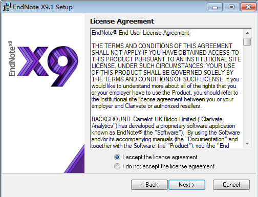 EndNote X9软件,选择I accept……,然后点击Next